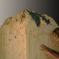 E’un viaggio che parte da Il Silenzio delle Fate, evocativa installazione con 24 elementi realizzata nel 1990, per giungere a I Cercatori di Luce, la videoinstallazione su tre schermi recentemente esposta al PalaCinema di Locarno e al Meet Digital Culture Center di Milano. Non mancano nemmeno i riferimenti al lavoro plastico Lo Spirito della Rosa entrato a far parte in permanenza della collezione del Quirinale. Un percorso di grande coerenza che l’ha vista protagonista di un’indagine dove le tecnologie e le nanotecnologie (i suoi primi lavori in 3D risalgono al 2003) sono state occasione per esplorare l’invisibile in un dialogo che sfiora i confini dell’immaginario, come avviene con la scultura in legno Les Manteillons du Mont Blanc composta da circa tremila pezzi che si aggregano come molecole preservando la forma variegata del Monte Bianco. Attraverso piccoli forellini poi è possibile intrufolarsi nella montagna osservando i “Manteillons”, gli spiriti o i folletti che secondo la leggenda sono imprigionati tra i crepacci.
